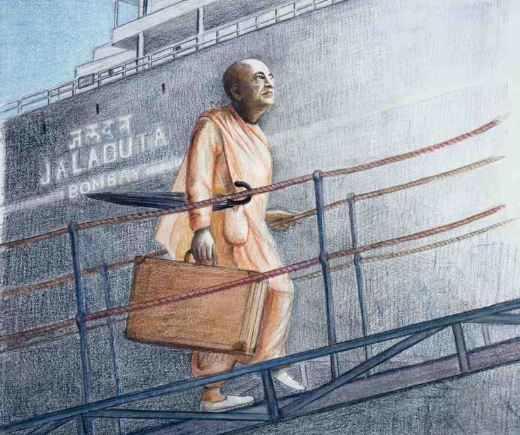 In 1965, at age 69, he traveled to New York on the cargo ship Jaladuta. Suffering two heart attacks and arriving with just 40 rupees, he carried the order of his spiritual master to spread Krishna consciousness globally.